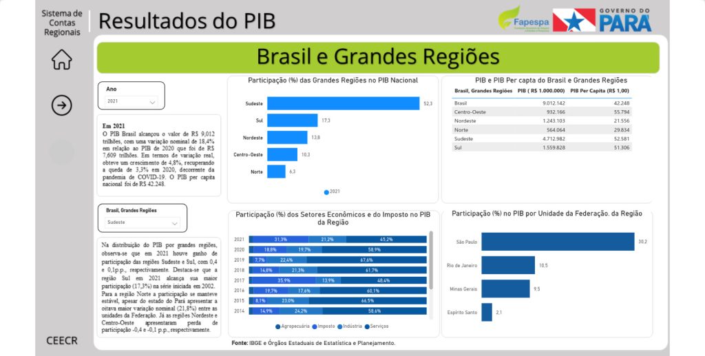 Os dados do Produto Interno Bruto (PIB), o PIB Per capita dos Estados e o valor adicionado do crescimento econômico das atividades econômicas agora estão disponíveis de forma mais acessível aos paraenses. A Fundação Amazônia de Amparo a Estudos e Pesquisas (Fapespa), lançou a nova plataforma, o Dashboard, que facilita o acesso às referidas informações.