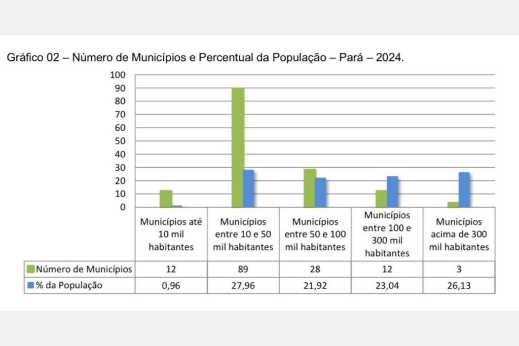 O município de Belém continua sendo o mais populoso do Estado, com 1.398.531 habitantes, seguido por Ananindeua com 507.838, Santarém com 357.311, Parauapebas com 298.854 e Marabá com 288.513 habitantes. Juntos, esses cinco municípios somam mais de 2,8 milhões de habitantes, agregando cerca de 32% da população do Pará. Por outro lado, Bannach é o município paraense com a menor população, com 4.252, seguido de São João da Ponta, com 4.509, e Sapucaia, com 6.160 habitantes.