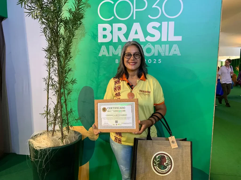 “Acabei de receber o ‘Selo Amazônia Mulher’, e o considero muito importante para nós, mulheres da Amazônia, e principalmente nesse momento de COP, momento que o mundo está olhando para a Amazônia. Nós estamos recebendo esse certificado que, para mim, é um reconhecimento muito importante da nossa cultura, da nossa arte milenar, que é a cerâmica, a cerâmica marajoara do Paracuri”, declarou Rosilene Trindade, uma das certificadas.